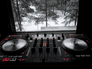 Numark NS6+Pioneer DDJ SP1, Shure SRH750DJ-luurit, Behringer Truth B2030A monitorit, Mac+Serato